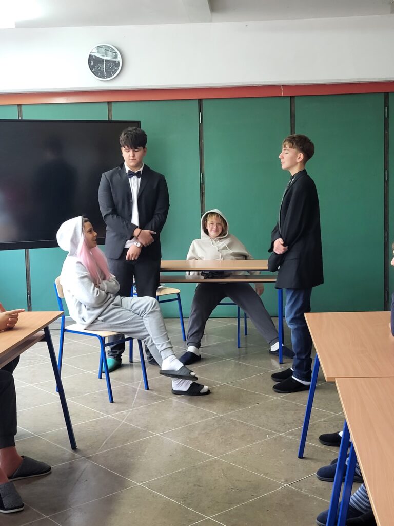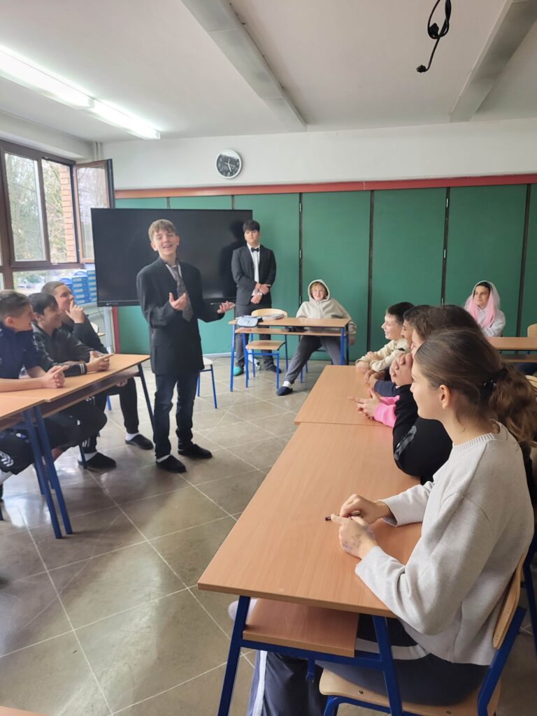 Učenici 7. b razreda na satu hrvatskoga jezika sudili su jedni drugima. Pitate se kako je to moguće? Vrlo jednostavno. Mjesec studeni obilježilo je čitanje djela Vjenceslava Novaka „Iz velegradskog podzemlja“ čija se radnja vrti oko jednog nesretnog slučaja i njegovih posljedica. Učenicima su podijeljene uloge sudca, odvjetnika tužitelja, odvjetnika branitelja, optuženika, svjedoka i porote. Zadatak porote bio je odlučiti je li optuženi Mika kriv ili nije te obrazložiti svoju odluku. Učenici su uživali u ovom zadatku te su naučili da književno djelo može promatrati iz različitih perspektiva, kritički razmišljati, argumentirano iznositi svoje mišljenje i uvažavati stavove drugih, a ujedno su na zanimljiv i kreativan način povezali književnost sa stvarnim životom. (D. K. P.)