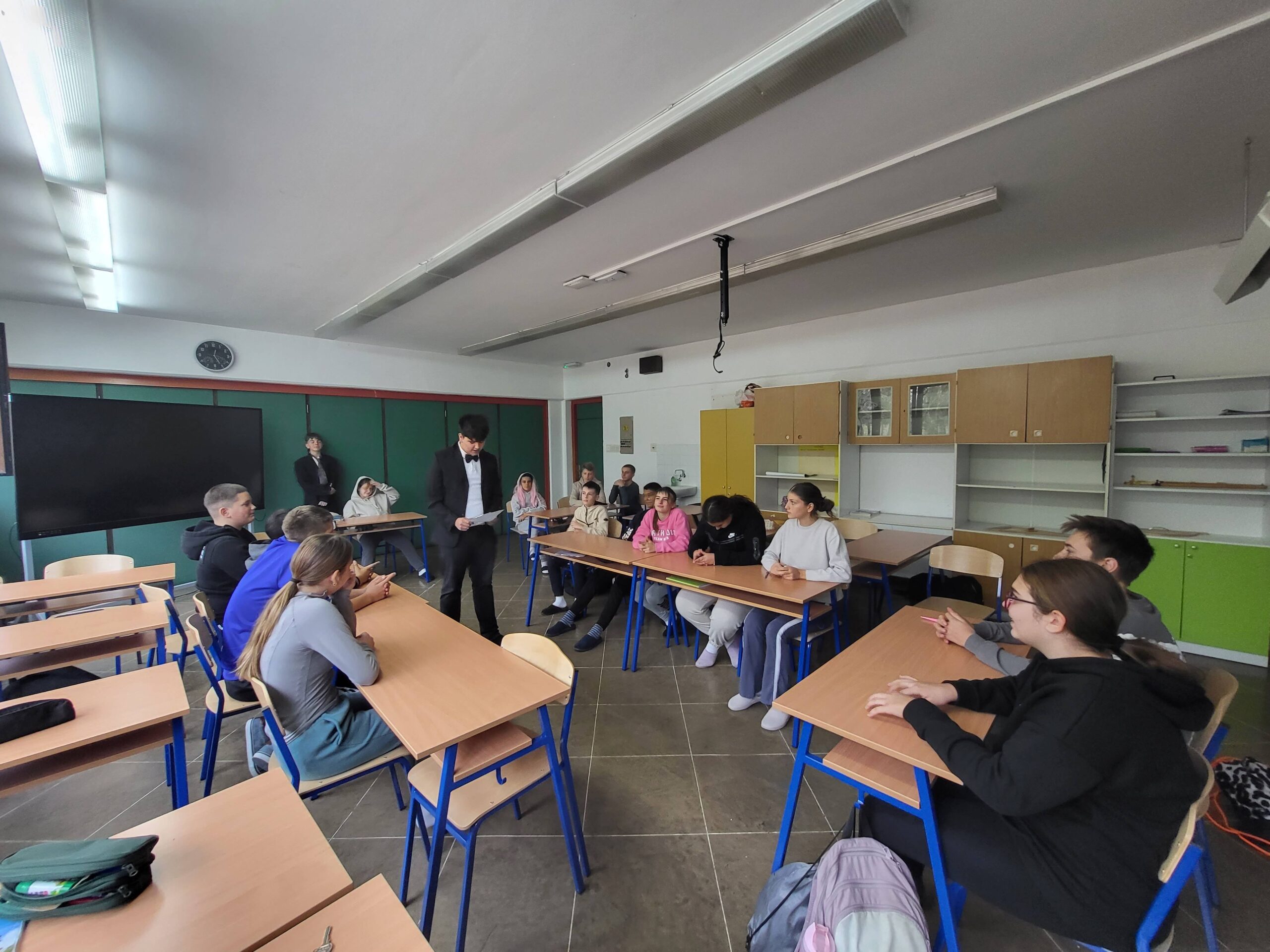 Učenici 7. b razreda na satu hrvatskoga jezika sudili su jedni drugima. Pitate se kako je to moguće? Vrlo jednostavno. Mjesec studeni obilježilo je čitanje djela Vjenceslava Novaka „Iz velegradskog podzemlja“ čija se radnja vrti oko jednog nesretnog slučaja i njegovih posljedica. Učenicima su podijeljene uloge sudca, odvjetnika tužitelja, odvjetnika branitelja, optuženika, svjedoka i porote. Zadatak porote bio je odlučiti je li optuženi Mika kriv ili nije te obrazložiti svoju odluku. Učenici su uživali u ovom zadatku te su naučili da književno djelo može promatrati iz različitih perspektiva, kritički razmišljati, argumentirano iznositi svoje mišljenje i uvažavati stavove drugih, a ujedno su na zanimljiv i kreativan način povezali književnost sa stvarnim životom. (D. K. P.)