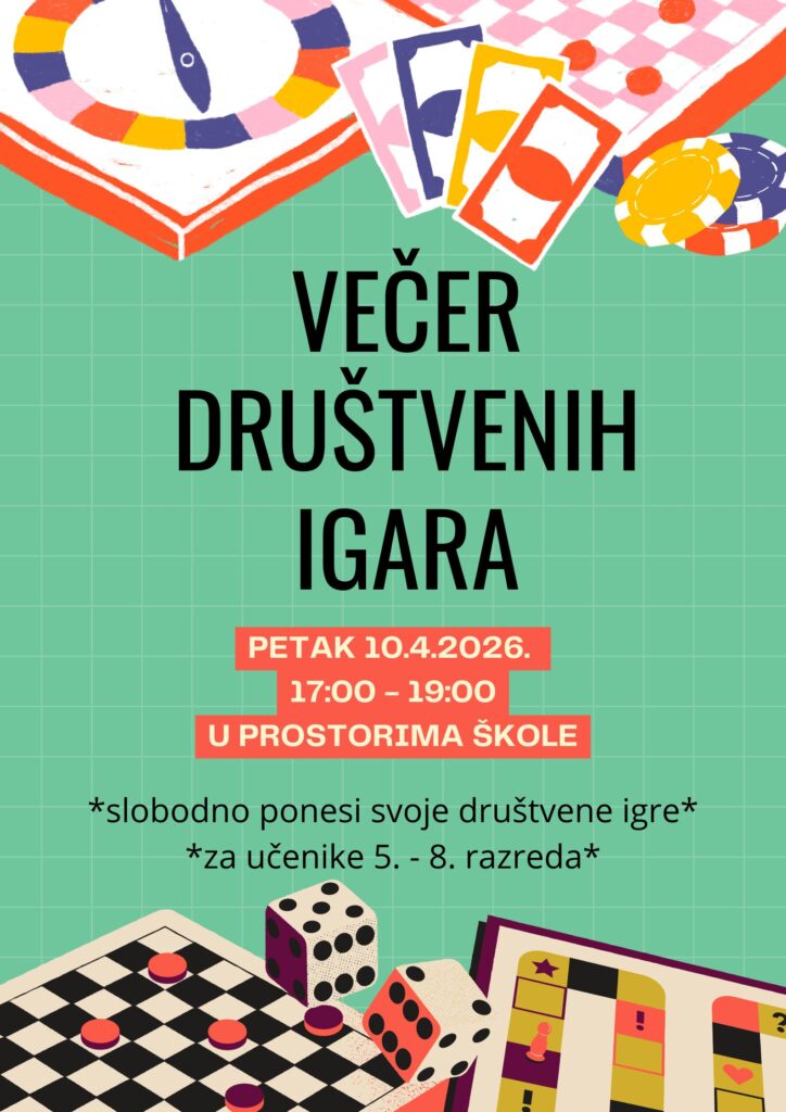 Događaj se organizira povodom Međunarodnog dana društvenih igara koji se obilježava 11. travnja. Večer društvenih igara održat će se u petak 10. travnja 2026. godine od 17:00 do 19:00 u prostorima škole.